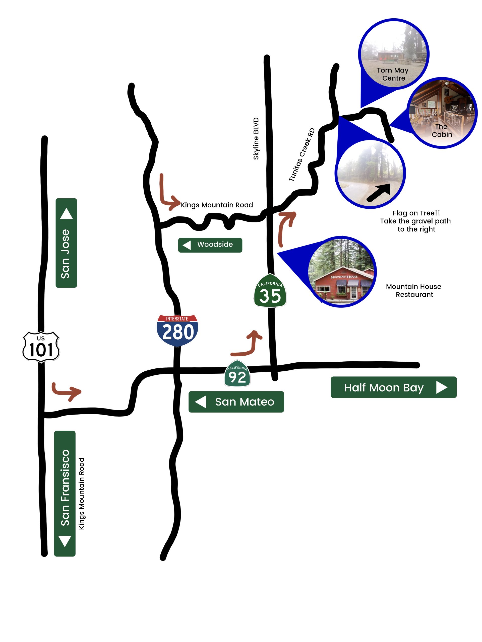 IMPORTANT: Start your GPS BEFORE you depart. NOTE, there is NO cell service once you get past Skyline Blvd, so you can NOT restart your GPS nor call for directions without back tracking. Allow yourself additional time- enjoy the Fall ride up through the woodside hills!